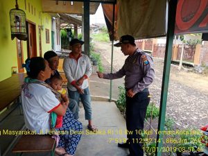 Bertempat di Lingkungan Jl.Terusan Dewi Sartika Rt 10 Rw 10 Kel.Temas Kec /Kota Batu, tepat hari ini Jum’at tanggal 18 Januari 2019 pukul 09.00 Wib anggota memberikan himbauan kepada warga sekitar. Salah satunya yaitu agar masyarakat berpartisipasi bersama Polri menciptakan keamanan lingkungan yang kondusif terlebih dalam menyambut Pileg dan Pilpres tahun 2019. Walaupun berbeda pilihan agar senantiasa mengutamakan kerukunan dan persatuan kesatuan bangsa. Juga disampaikan pada warga untuk meningkatkan kewaspadaan dilingkungan sekitar guna meminimalkan kesempatan tindak kejahatan dan pelopor keselamatan dengan mematuhi segala tatib berlalu lintas dalam berkendara merupakan kewajiban yang harus di terapkan pada diri sendiri.