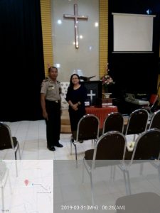 Dalam memberikan rasa aman dan nyaman kepada masyarakat yang sedang melaksanakan ibadah, Kapolsek Bumiaji AKP Nyoto Gelar, S.Psi bersama dengan Kanit Binmas Aiptu Sudarmaji melaksanakan pengamanan kegiatan ibadah wilayah Kec. Bumiaji Kota Batu.tepatnya digereja pantekosta Elsadday Pandanrejo dengan pendeta Yusak sihombing Minggu, 31-3-2019